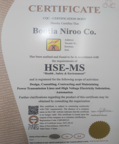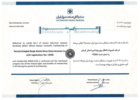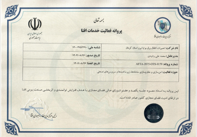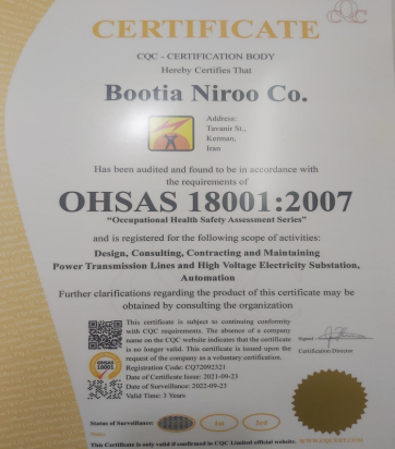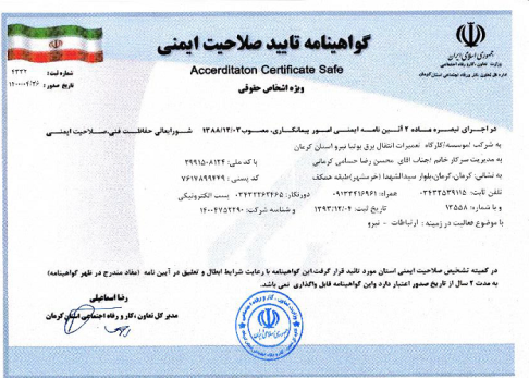 گواهی تایید صلاحیت شده در زمینه نگهداری و تعمیرات شبکه های انتقال نیرو از شرکت توانیر